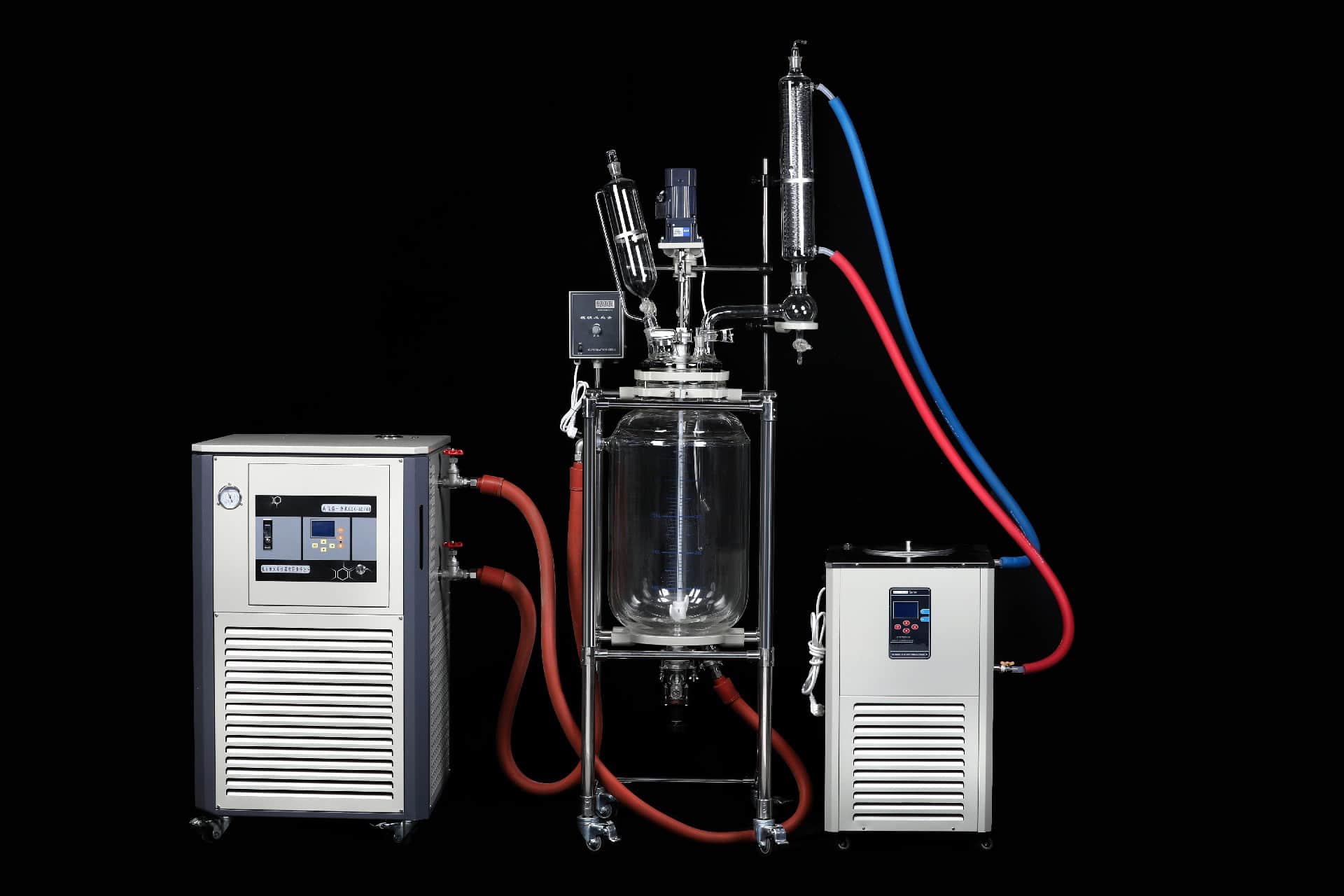 設(shè)備組成:高低溫一體機(jī)+雙層玻璃反應(yīng)釜+低溫冷卻液循環(huán)泵